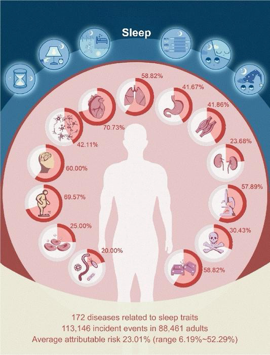 分析发现,共有172种疾病与不良睡眠特征显著相关,其中42种疾病的风险因睡眠问题翻倍,帕金森病、2型糖尿病和急性肾衰竭等92种疾病有超过20%的发病风险可归因于不良睡眠。具体而言: